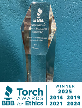 Vision2Voice Healthcare Communications is honored to be named one of five winners of the 2025 BBB International Torch Awards for Ethics! V2V has previously been awarded in the USA at the regional level on five previous occasions, but this recognition marks our first on the international stage. For over a decade, the BBB’s Torch Award for Ethics has been the only major award V2V has submitted for because it’s the only award that affirms our commitment to our core values, which have shaped every decision and client relationship.